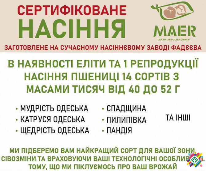 Пропонуємо придбати сертифіковане насіння пшениці відомих сортів, яке виготовлене на сучасному насіннєвому заводі імені Фадеєва. Наш асортимент включає 14 сортів насіння пшениці, серед яких є еліти та репродукція. До числа доступних сортів входять: "Щедрість Одеська", "Мудрість Одеська", "Катруся Од...