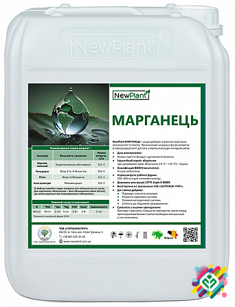NewPlant Mn-70 IQ* - Рідке добриво, що містить марганець, амінокислоти та гумат. Це призначено для застосування на ранніх стадіях розвитку рослин у період відсутності доступу до ґрунту через негативні погодні умови. Склад: - N-60 г/л - *Mn-70 г/л - *Mo-1 г/л - *Mg-5 г/л - Гумат-3% - ПАР-3% - Амінок...