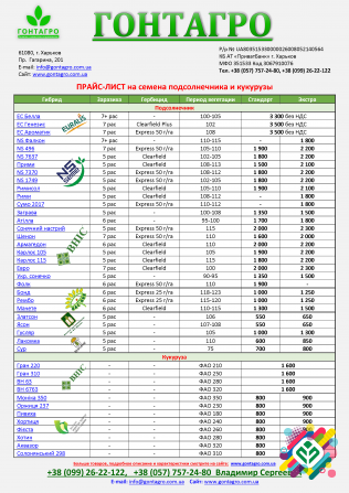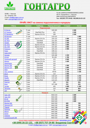 **Продукція «Гонтагро»: Урожайні семена підсоняшника та кукурудзи** Компанія «Гонтагро» пропонує придбати врожайні семена підсоняшника та кукурудзи від відомих виробників, таких як Вніс, Нертус, ЮгАгролідер, Євраліс, Інститут ім. В.Я. Юр'єва та інші. В асортименті є семена для вирощування за класич...