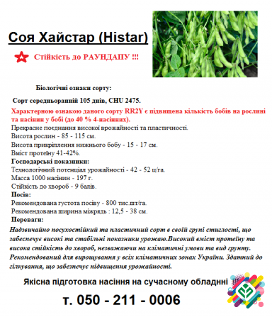 Сорт сої Хайстар (Histar): Огляд технічних характеристик Соя Хайстар є середньостиглим сортом з тривалістю вегетації 105 днів та СHU 2375. Однією з ключових особливостей цього сорту є наявність гена RR2, що призводить до збільшення кількості бобів на рослину та кількості насінин у бобі (до 40% 4-се...
