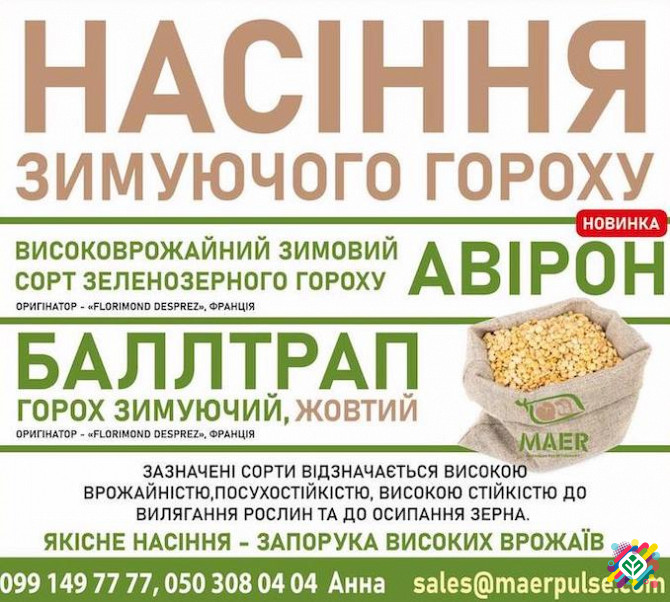 Насіння озимого гороху від компанії "МАЕR Pulse" Компанія "МАЕR Pulse" пропонує насіння озимого гороху в двох сортів: зелений сорт Авірон та жовтий сорт Баллтрап. Наші насіння відповідають найвищим стандартам якості та гарантують високий врожай. Характеристики продукту: - Сорт: зелений Авірон, жов...