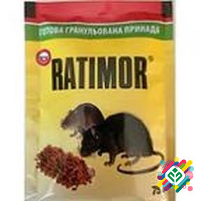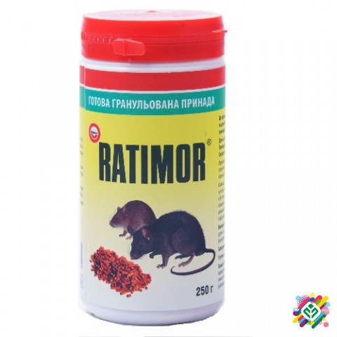 Ратимор (Ratimor) - 250 грам гранульована приманка для боротьби з щурями та мишами, готова до використання. Призначена для знищення гризунів у житлових приміщеннях, складах, підвалах, а також на ділянках. Містить діючу речовину бромодіолон у концентрації 0,005, а також приваблюючі речовини та муміфі...
