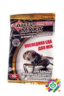 **Антимуха: ефективний засіб для боротьби з мухами** **Діючі речовини:** метоміл, трансфлутрин. **Форма препарату:** гранули. **Спосіб застосування:** Для знищення дорослих мух, гранули розкладаються на підкладки (кришки) в обсязі 2,5 г/1 м². Одного пакета вагою 10 г достатньо для обробки 4 м². П...