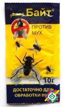 Гранульований продукт для боротьби з мухами, який містить феромон, що змушує мух легко поїдати приманку, що дозволяє ефективно боротися з цими шкідниками. "Байт муха" (гранула) містить бітрекс - дуже гіркий компонент, який запобігає ковтанню приманки тваринами та птахами, зробляючи "Байт муха" (гран...