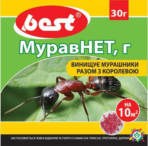 Упаковка: 30г, 300г, 900г "МуравНЕТ" - інсектицидна приманка у гранульованій формі, призначена для боротьби з мурашками. Знищує усі види мурашок поруч з будинками (на терасах, тротуарах, доріжках). Препаративна форма: гранули. Знищує мурашник разом із королевою! Діючі речовини: S-метопрен - 0,75 г...