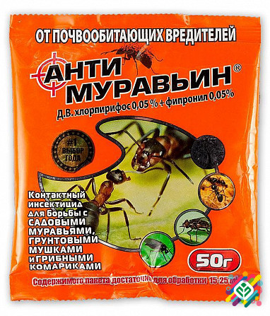 Високоефективний інсектицидний засіб для знищення мурах на ділянках, в приватних будинках та нежитлових приміщеннях. Препарат застосовується для знищення: - садових і домашніх мурів усіх видів, - ґрунтових мух, - грибних комариків. Склад порошку Антимуравьин включає хлорпірифос, атрактант, цукор, бі...