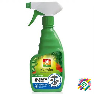 Доктор "Мікро" (спрей від хвороб та гнилі) 300 мл. Доктор "Мікро" 300 мл від хвороб та гнилі для кімнатних рослин - спрей 300 мл. Цей продукт має подвійну дію - він лікує та зміцнює імунітет. "Доктор Мікро" є добривом та фунгіцидним добавком для лікування та профілактики комплексу грибкових захворю...