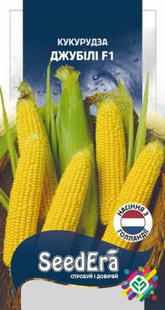 Мінімальне замовлення - 300 грн Мінімальна кількість 10 шт Джубілі F1 - стійкий та високоврожайний гібрид кукурудзи. Цей сорт належить до цукрової кукурудзи з середнім терміном дозрівання. Форма плоду циліндрична, з довжиною 21-23 см. Призначення кукурудзи - споживання у свіжому вигляді або для кон...
