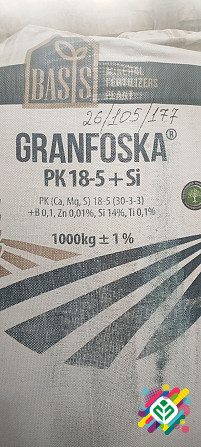 Мінеральне добриво Гранфоска 18-5+Si від виробника BASIS є складним добривом, яке містить азот (N), фосфор (P), калій (K) та кремній (Si). Покриваючи основні потреби рослин у поживних речовинах, воно також містить кальцій (Ca), магній (Mg) та сірку (S) у співвідношенні 18-5 (30-3-3). Крім того, в ск...