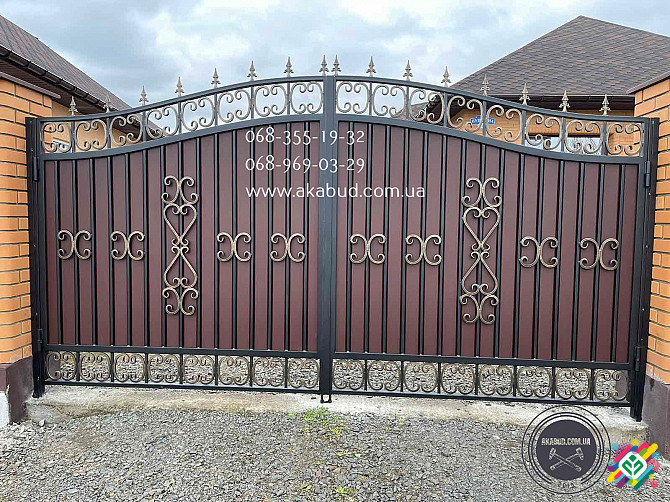 Наша компанія спеціалізується на виготовленні високоякісних кованих розпашних воріт з профнастилу, навісів, парканів, решіток, бесідок та навісів для будинків. Усі наші вироби виготовляються на професійному обладнанні з використанням найсучасніших технологій. **Ковані розпашні ворота з профнастилу*...