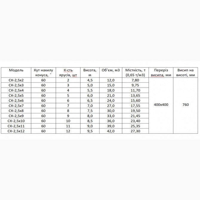 Продаю силоси з конічним днищем від виробника MICHAL. Об'єм від 9 до 672 м³. Матеріал - оцинкована сталь RUUKKI, що забезпечує високу міцність та довговічність конструкції. Комплектація включає в себе: конусний днище під кутом 45° з опорами, стінки з плоского листа з горизонтальними та вертикальни...