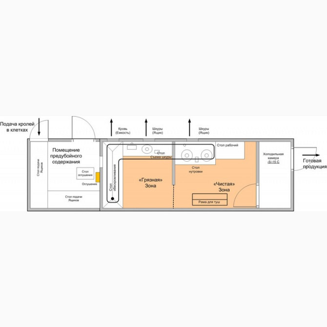 • Зона убоя (грязный цех) – где происходит закалывание кроликов надрезом горла и обескровливание;• Зона обработки (чистый цех) с холодильником для хранения продукции.Производительность: 1000 голов в смену (120 голов в час)Функциональность: Анатомическая распиловкаУпаковка в вакуум (возможно ГМС)Упак...