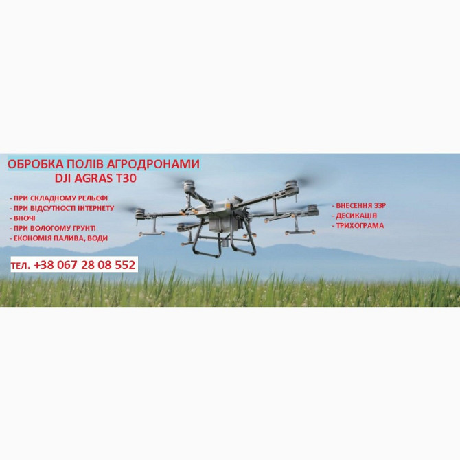 Працюємо по всій УкраїніОбробка землі дронами, агродронами, внесення ЗЗР, десикація рослин сучасним модефікованимАГРОДРОНОМDGI AGRAS Т30.ОБРОБКА ПОЛЯ ДРОНОМ МОЖЛИВА:- При вологих грунтах- При складному рельєфі: : нерівності, перешкоди, лінії електропередачі.- При неправильних формах полів- При різни...