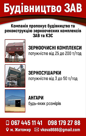 Будівництво та реконструкція ЗАВ і КЗС. Компанія з м. Житомир пропонує професійне будівництво та реконструкцію зерноочисних комплексів (ЗАВ, КЗС) під ключ. Наша спеціалізація: Зерноочисні комплекси. Потужність: від 25 до 200 т/год. Зерносушарки. Потужність: від 3 до 50 т/год. Ангари. Будь-яких роз...