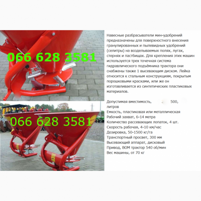 Технічний опис машини для внесення мінеральних добрив: Машина для внесення мінеральних добрив призначена для розподілу твердих гранульованих та кристалічних добрив на полях та в садах з великою точністю та ефективністю. Завдяки своїй конструкції та технічним характеристикам, ця машина є незамінним ...