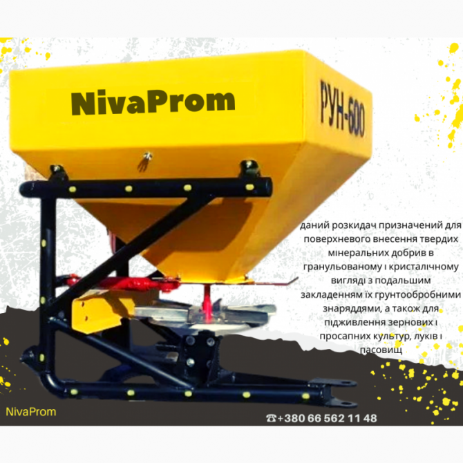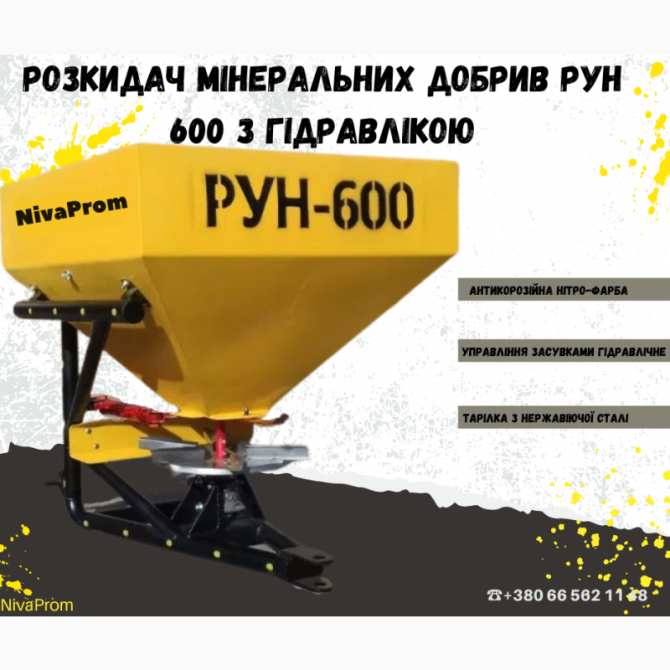 Розкидач мінеральних добрив РУН 600 з гідравлікою є ефективним інструментом для точного розподілу добрив на полі. Цей навісний розкидач призначений для кріплення на триточковий навісний пристрій трактора. Привід від ВОМ трактора здійснюється через карданно-телескопічний вал, що забезпечує надійну тр...