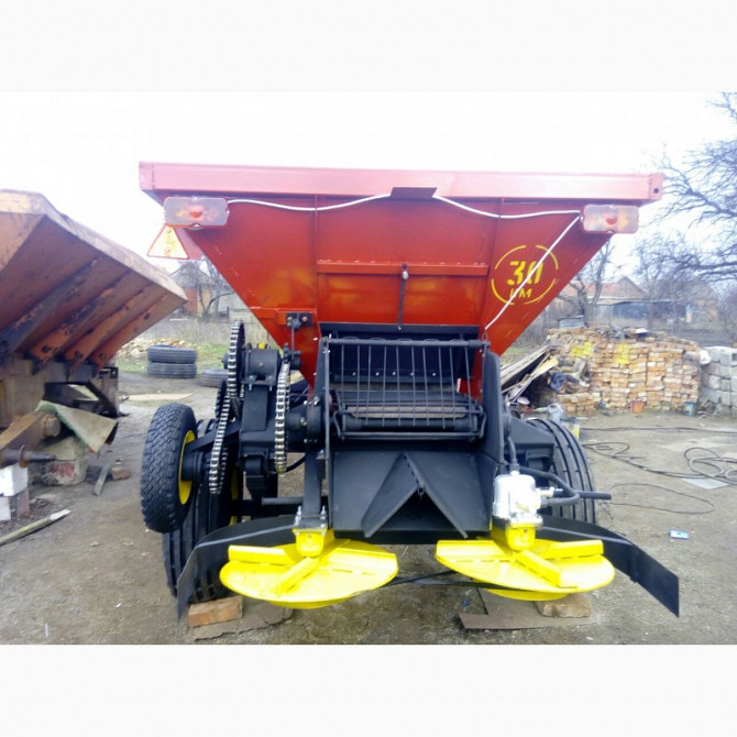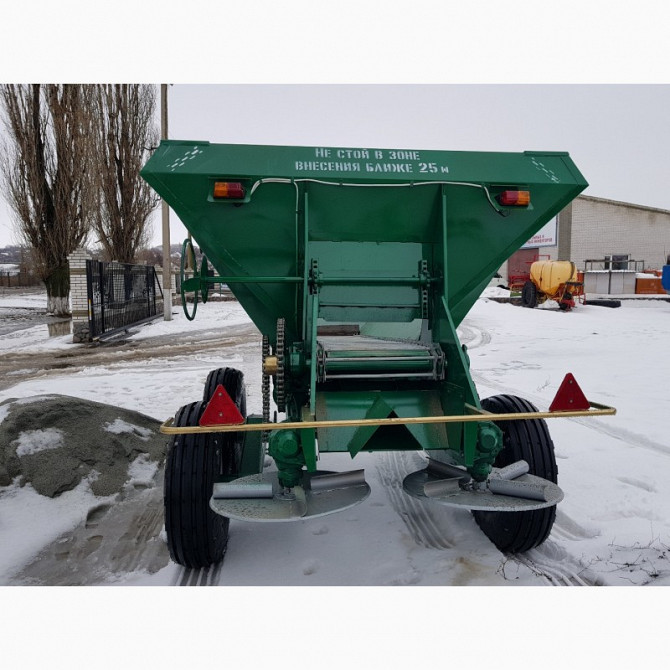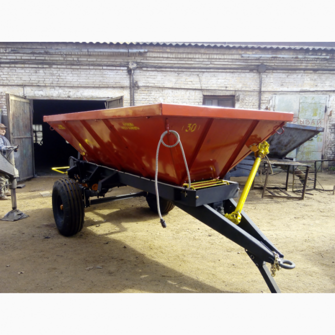 Розкидач мінеральних добрив 1-РМГ-4 призначений для точного та рівномірного розподілу твердих мінеральних добрив, таких як дефекат, пісок, гіпс, курпомет, на поверхню ґрунту. Цю операцію можна виконувати навіть під час руху машини по технологічній колії. Розкидач складається з одновісного причепа, к...