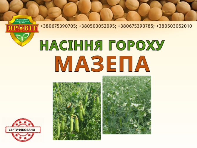 Продукт: Насіння гороху "Мадонна 1" (репродукція) Характеристики продукту: - Сорт: "Мадонна 1" - Тип: репродукція насіння гороху - Фасування: мішки по 50 кг Технічна інформація: - Сорт "Мадонна 1" відомий своїм високим врожайним потенціалом та стійкістю до погодних умов. - Репродукція насіння горо...