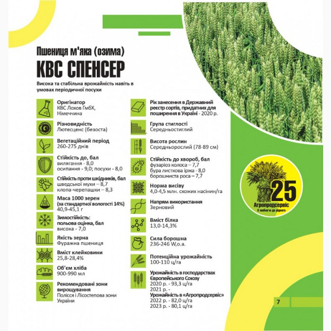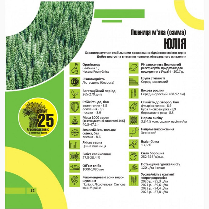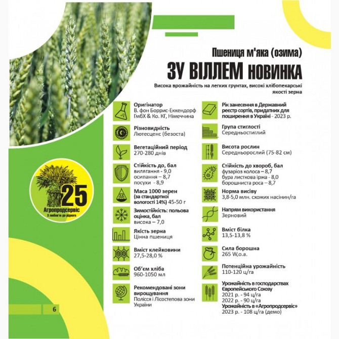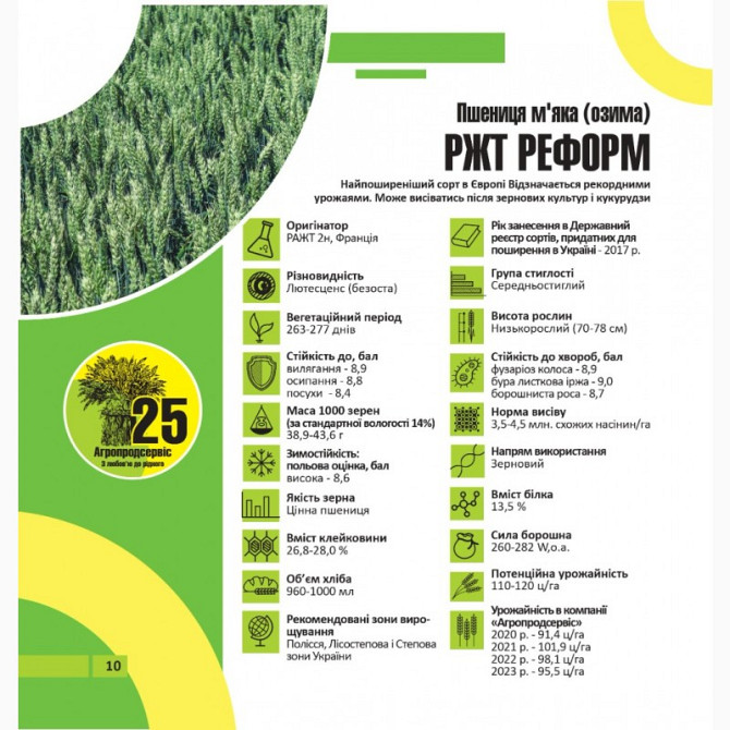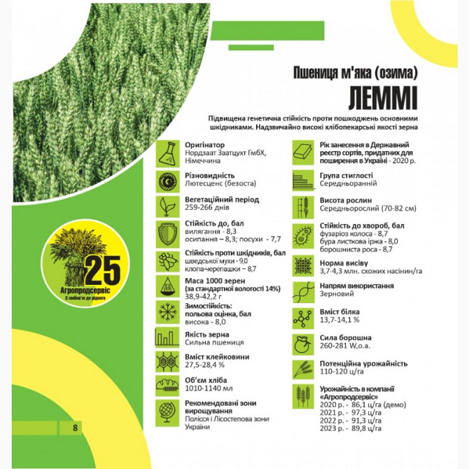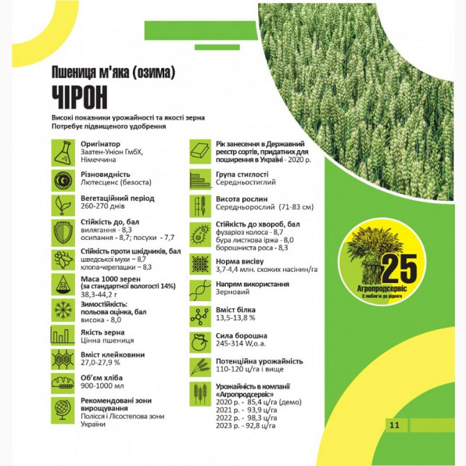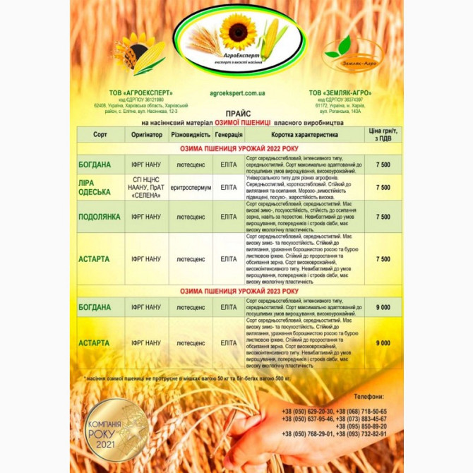Пшениця озима - сорти: Астарта, Благодарка, Богдана, Ліга, Оранта, Подолянка, Фортеця, Шестопалівка. У наявності такі сорти та репродукції: 1-репродукція еліта. Сорти: Астарта, Богдана, Благодарка Одеська, Катруся Одеська, Ліга Одеська, Мудрість Одеська, Оранта Одеська, Подолянка, Шестопалівка, Фор...