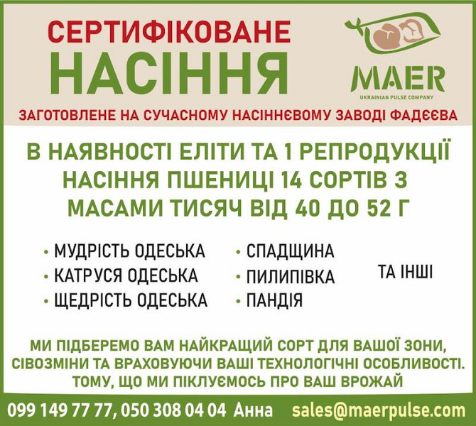 У нас в наявності сертифіковане насіння пшениці, яке включає в себе елітні та репродукційні сорти. Наш асортимент налічує 14 сортів насіння пшениці з масами від 40 до 52 грами, включаючи "Мудрість Одеська", "Катруся Одеська", "Щедрість Одеська", "Спадщина", "Пилипівка", "Пандія" та інші. Насіння, я...