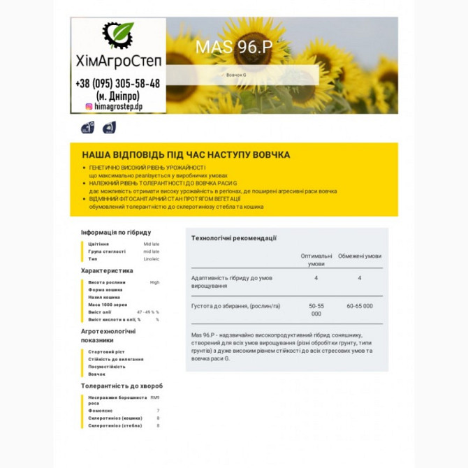 MAS 96.P - Генетично високий рівень урожайності під час наступу вовчка MAS 96.P є сортом соняшнику, який відзначається високим рівнем урожайності, особливо в умовах, де поширені агресивні раси вовчка. Цей сорт проявляє належний рівень толерантності до вовчка раси G, що дозволяє отримати значний вро...