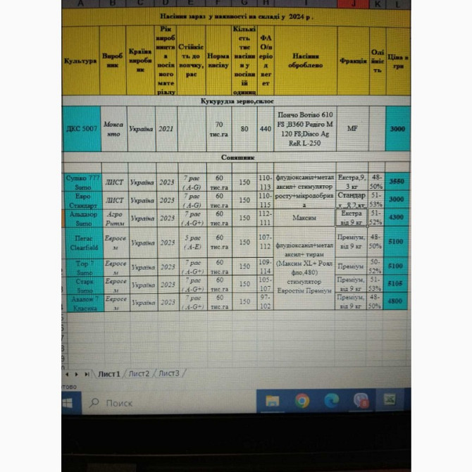 Продаю насіння соняшнику великим оптом. Нижче наведені деталі кожного виду насіння: 1. Насіння соняшнику "Суліко" (Sumo) - Ціна: 3550 грн - Фракція: екстра - Вага мішка: 9,3 кг - Виробник: ЛИСТ 2. Насіння соняшнику "Евростандарт" (Евролайтинг) - Ціна: 3000 грн - Фракція: стандарт...