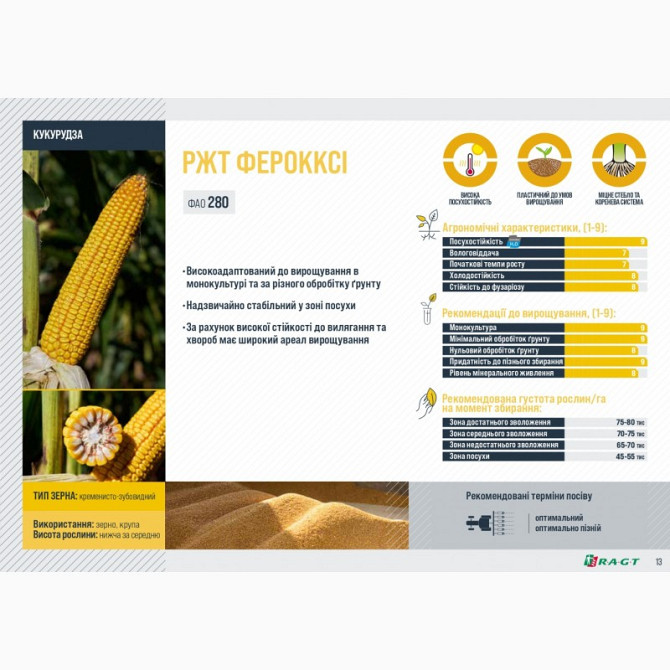 Кукурудза РЖТ ФЕРОККСІ є сортом кукурудзи середньостиглих груп зрілості (ФАО 280), високоадаптованим до вирощування як в монокультурі, так і за різних умов обробітку ґрунту. Цей сорт відрізняється надзвичайною стійкістю до посухи, вилягання та хвороб, що розширює його ареал вирощування. Зерно кукур...