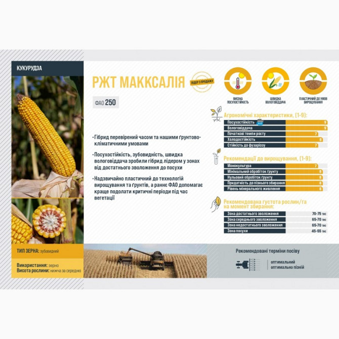 **Гібрид кукурудзи РЖТ МАККСАЛІЯ** Гібрид кукурудзи РЖТ МАККСАЛІЯ призначений для використання у вирощуванні зерна. Він належить до групи середньостиглих гібридів з рекомендованим FAO індексом 250. Цей гібрид є перевіреним часом та відомий своєю адаптованістю до ґрунтово-кліматичних умов регіону. ...
