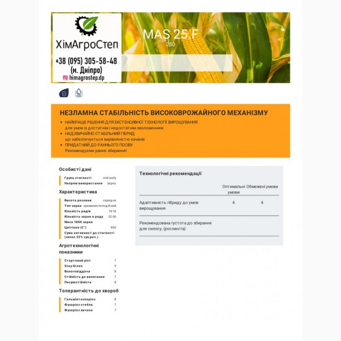 **Насіння кукурудзи Mas25.F (ФАО 250) - Високоврожайний і стійкий гібрид для екстенсивної технології вирощування** Умови вирощування: - **Зволоженість**: від достатньої до недостатньої зволоженості - **Стержністість качанів**: висока - **Посів**: ранній - **Стиглість**: середньорання Технічні хара...