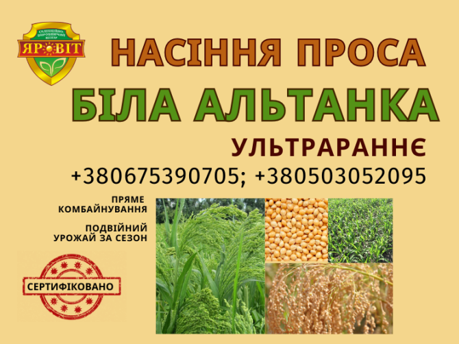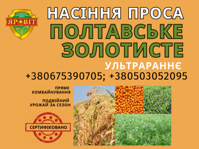 Продаю просо біле (Panicum miliaceum) - 500 тонн. Виробник сільськогосподарської продукції. Продукція не підлягала обробці пестицидами, зокрема гліфосатами. Забезпечую будь-яку форму оплати; безготівковий розрахунок з ПДВ, доларовий контракт (тільки на умовах FCA). Можлива співпраця з нерезидентами....