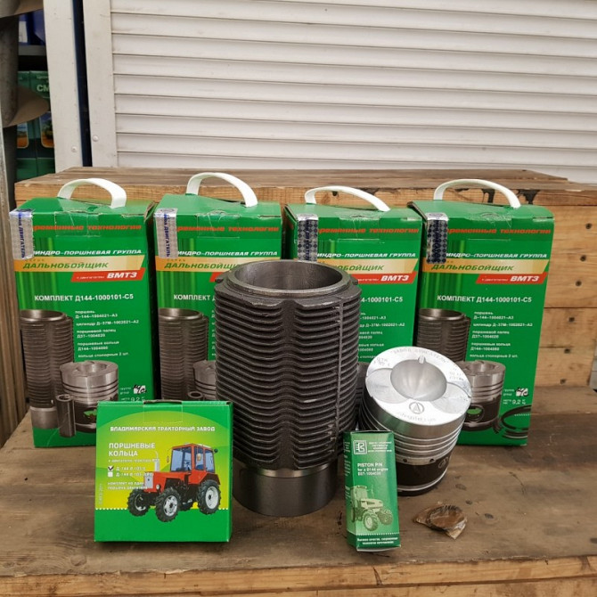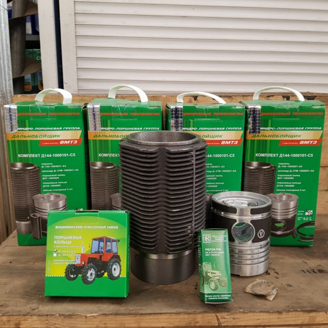 Поршнева група виробництва Володимирського Моторо-тракторного Заводу "ВМТЗ" Комплектується поршнем 5К 2 маслознімних кільця У комплекті: 4 гільзи, 4 поршня, комплект поршневих кілець (Д144-1004060Б1), 4 пальця: 38 кг