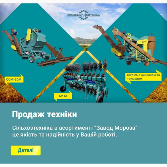 Продам очисник вороху самохідний ОВС-25 Очисник вороху самохідний ОВС-25 з продуктивністю 25 т/год призначений для очищення зернового вороху колосових, круп'яних, зерново-бобових культур, кукурудзи, сорго, соняшнику, насіння рапсу від домішок на відкритих полях у всіх сільськогосподарських зонах кр...
