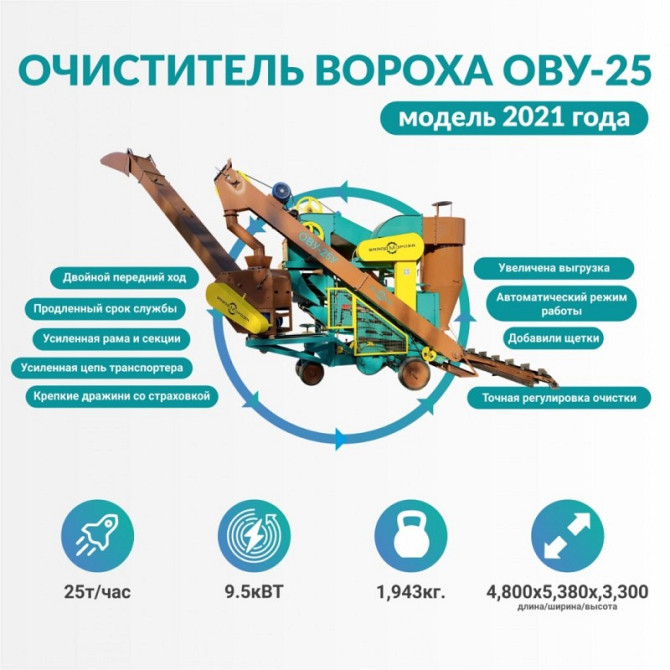 **Очисник вороху посилений ОВУ-25: Технічний опис** Очисник вороху посилений ОВУ-25 є високоефективним обладнанням для попередньої та первинної очистки зернового вороху колосових, круп'яних, зернобобових культур, кукурудзи, сорго, соняшнику від домішок на відкритих токах. Цей пристрій також може ви...