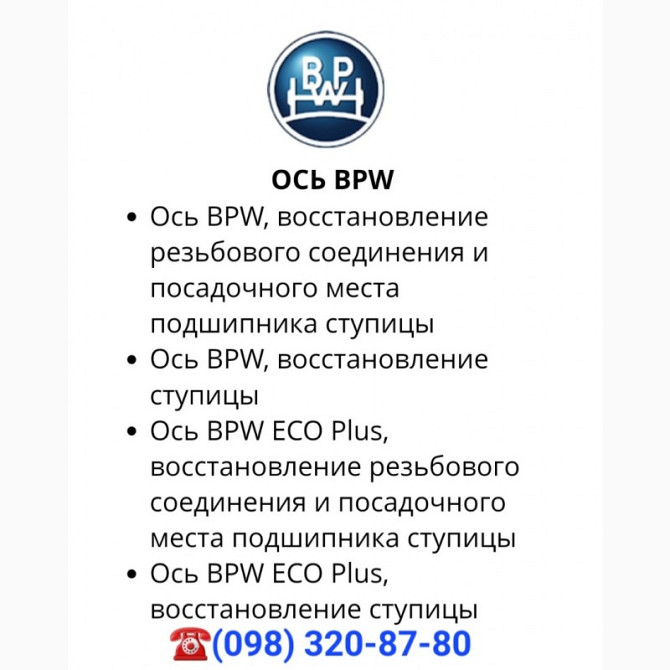 В даному технічному описі розглядається процес відновлення різьбового з'єднання та місця підшипника вузла колеса для вісі BPW, зокрема моделі ECO Plus. **Ось BPW ECO Plus** Вісь BPW ECO Plus є ключовим компонентом у системі підвіски вантажних автомобілів. Цей важливий елемент вимагає належного об...