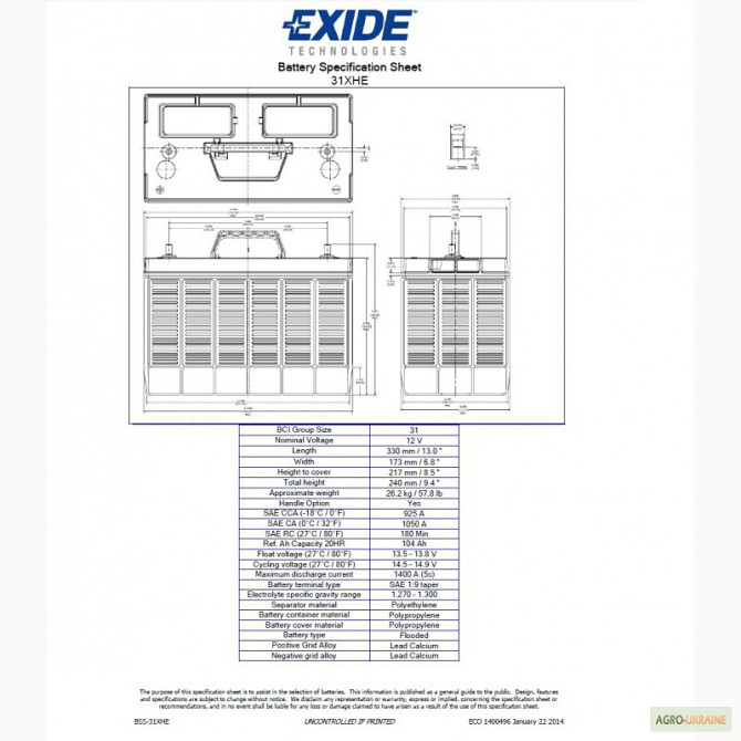 Група BCI розміру 31 є електролітною акумуляторною батареєю з напругою 12 В. Розміри батареї становлять 330 мм у довжину, 173 мм у ширину, її приблизна вага складає 26,2 кг. Коефіцієнт ємності батареї за стандартом Ah складає 104 Ah при розряді протягом 20 годин. Максимальний струм розряду досягає 1...