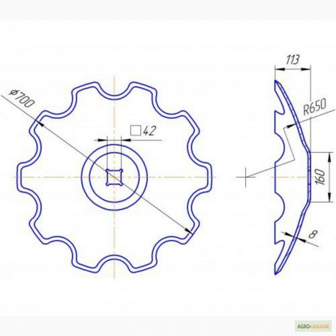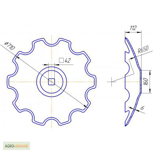 Краща якість, яка тільки можлива в Україні! внутрішній отвір діаметром 46 мм, не вирізний, гладка кромка, товщина 6 мм, вага 15 кг; зубів, товщина 6 мм; 4) Диск борони БДТ-4,2, зовнішній діаметр 650мм, внутрішній квадратний отвір 42х42 мм, не вирізний, гладка кромка, товщина 8 мм, можливе виготовлен...