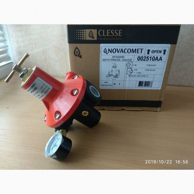 Продам редуктор (регулятор тиску газу) NOVACOMET APS 2000Продуктивність: 150 кг/година.Робочий діапазон тиску 1-3 bar. Тип різьблення вх/вих. : FEM-RC3/4. Укомплектовано манометром для контролю вихідного тиску. Використовується на зерносушарках українських, турецьких та американських виробників із в...