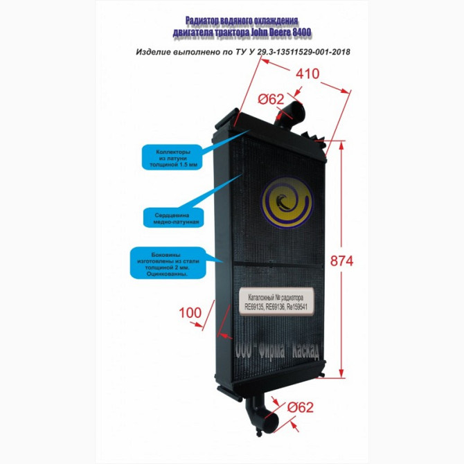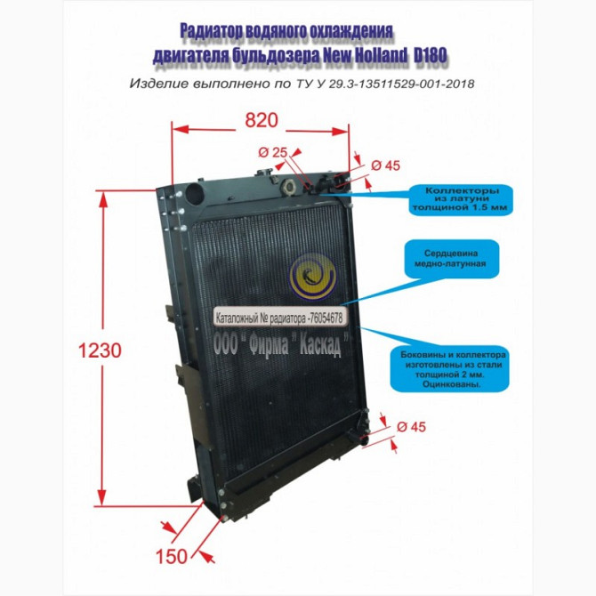 Радіатор водяного охолодження двигуна бульдозера New Holland D180 виготовлений ООО фірмою «Каскад» є аналогом радіатора з каталожним номером 76054678, широко використовуваним на спецтехніці. У виробі застосовані міднолатунне серцевина та колектори з латуні. Технічні параметри розроблені згідно з ТУ ...