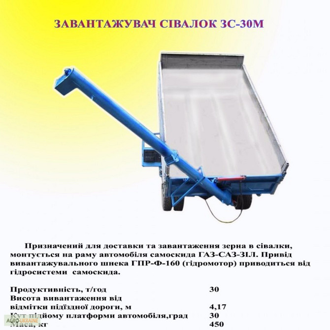 Шнек в сборі з гідромотором агрегується за допомогою борта та полуборта до будь-яких автомобілів та тракторів. Загрузчик сівалок ЗС-30М, ЗС-30М-01 призначений для доставки та висипання зерна для сівалок. Він встановлюється на автомобілі ГАЗ-САЗ-3507, ЗИЛ-ММЗ-554М. Загрузчик може бути змонтований к...