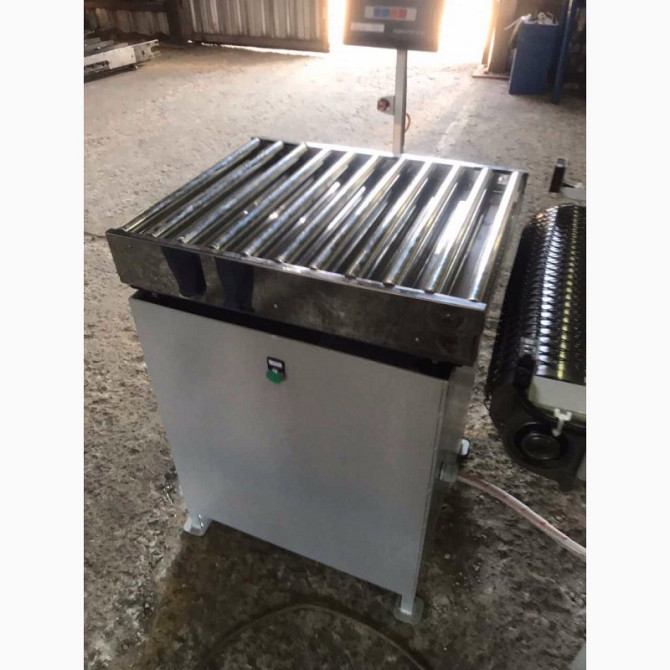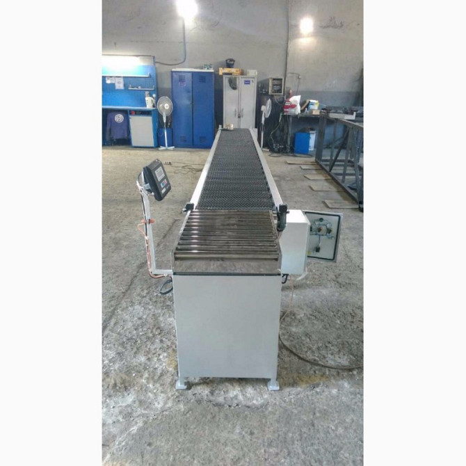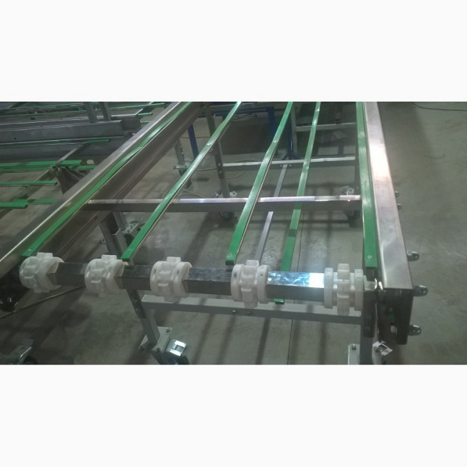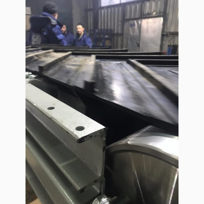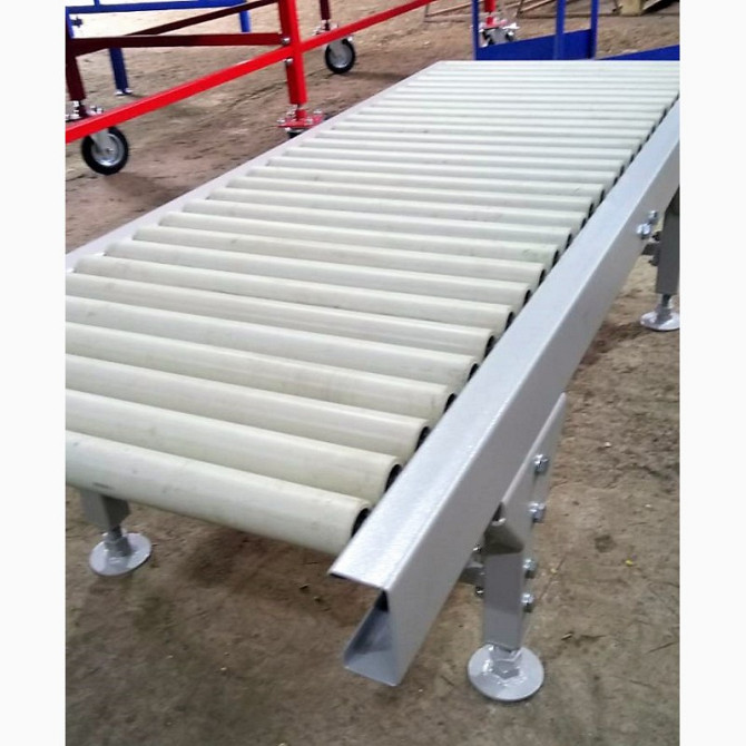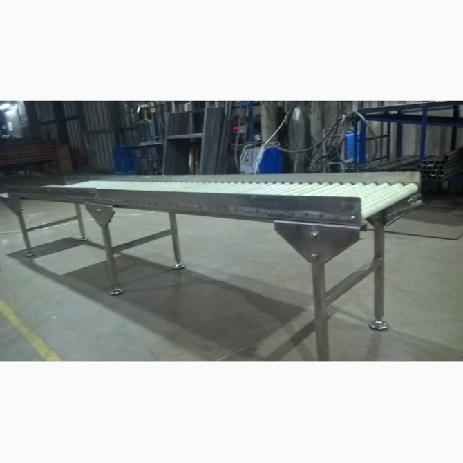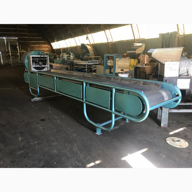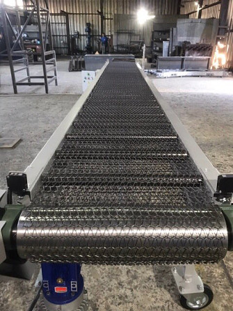 Конвейер і рольганг для перевезення вантажів Конвейер має наступні технічні характеристики: - Тип конвейера: горизонтальний, мобільний - Ширина ленти: 500 мм - Лента виготовлена з конструкційної сталі з сітчастим плетінням, стійка до температури +160°C - Лента рухається по роликах, забезпечено меха...