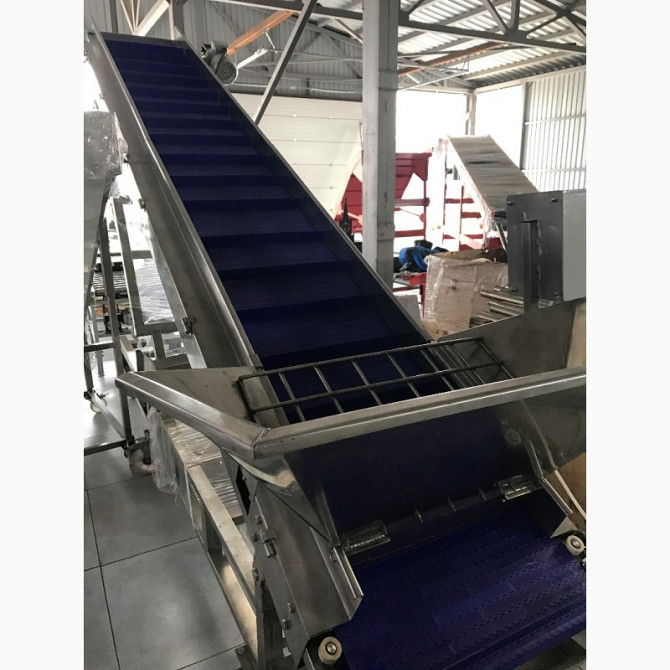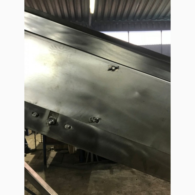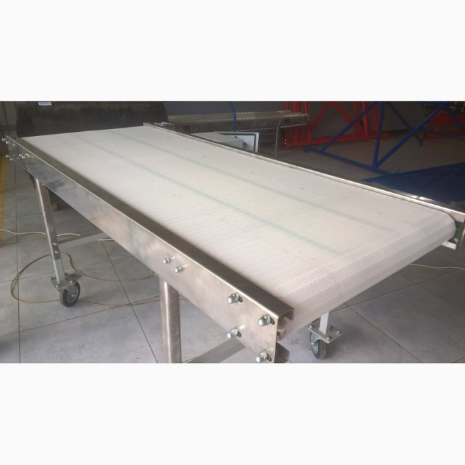 Ленточний транспортер призначений для переміщення снекової продукції. Виготовлений з нержавіючої сталі (AISI 304), обладнаний поліуретановою конвейерною стрічкою з харчовим допуском з наступними технічними характеристиками: - ширина транспортера: 380 мм - ширина стрічки з шевронами: 350 мм - в...