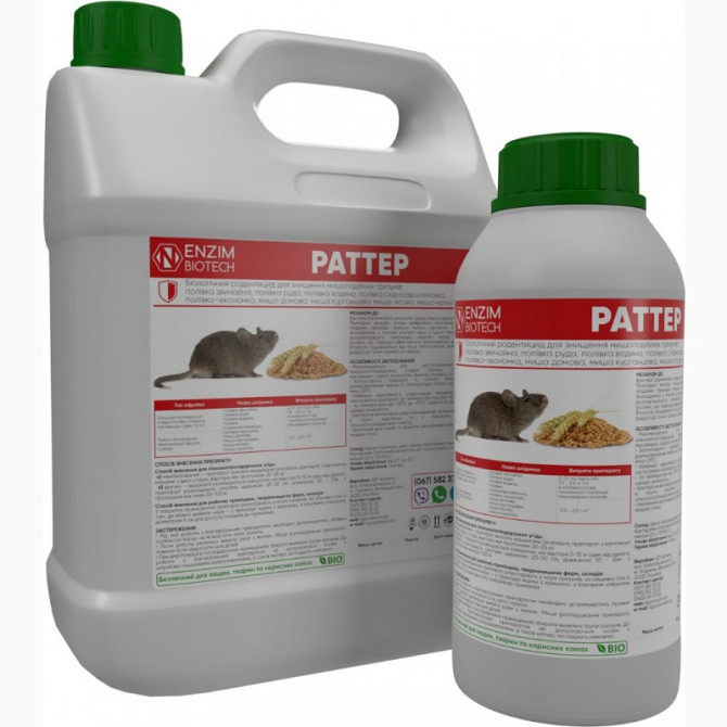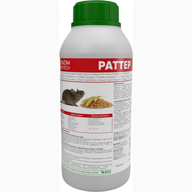 **Раттер** - це біологічний родентицид, який містить діючу речовину Salmonella enteritidis var. Issatschenko з титром не менше 2,0х109 КУО/мл. Препарат присутній у рідкій формі та доступний у упаковках по 1 л, 5 л та 10 л. Умови зберігання: Раттер слід зберігати при температурі від +2 °C до +10 °C...