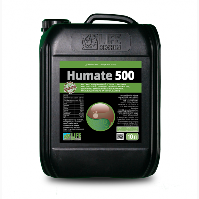 **Гумат 500: КОНЦЕНТРОВАНИЙ РОЗЧИН СОЛЕЙ ГУМІНОВИХ І ФУЛЬВОВИХ КИСЛОТ, АМІНОКИСЛОТ, МІКРОЕЛЕМЕНТІВ ПРИРОДНОГО ПОХОДЖЕННЯ** **Склад:** - Солі фульвових кислот: 250 г/л - Солі гумінових кислот: 250 г/л - Азот (N): 30 г/л - Фосфор (P2O5): 25 г/л - Калій K2O: 95 г/л - Залізо (Fe): 5 г/л - Марганець (Mn...
