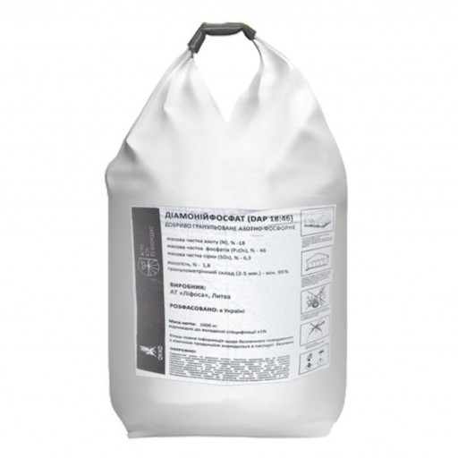 Пропонуємо до продажу добриво "Діамоній фосфат" з маркуванням NP 18:46 у біг-бег упаковці. Ціна є орієнтовною і може змінюватися в залежності від обсягу замовлення та умов поставки. Наші склади з добривами розташовані по всій території України. Мінімальна партія для замовлення становить 10 тонн, мож...