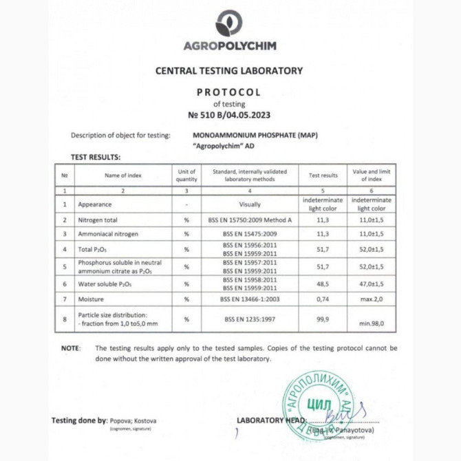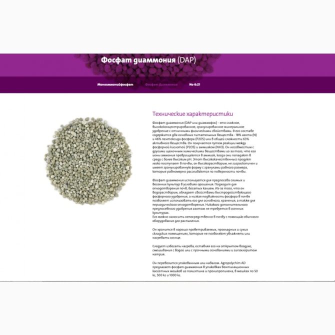 Моноамоній фосфат (МАФ або амофос) є комплексним висококонцентрованим мінеральним добривом, яке використовується для передпосівного та припосівного удобрення всіх основних сільськогосподарських культур на різних типах ґрунтів. Препаративна форма цього добрива - гранули від 1,0 до 5,0 мм, з вмістом н...