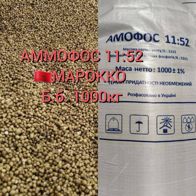 Пропонуємо до продажу такі види мінеральних добрив: - Амофос - Діамоній фосфат DAP (10-46, 18-46) - Моноамоній фосфат MAP (11-52) Упаковка: біг-бег. Ціна: орієнтовна і залежить від об'єму закупки, умов поставки та оплати, складу добрива та країни виробництва. Склади з добривами розташовані по всі...
