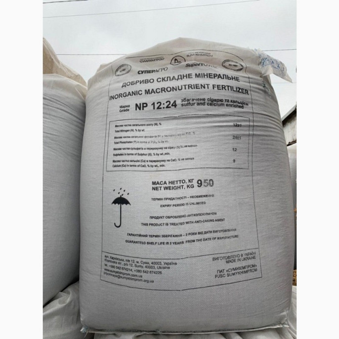 Високоякісне двокомпонентне мінеральне добриво з оптимальним співвідношенням основних поживних речовин N:P2O5=1:2 (Азот 12%, Фосфор 24%, Сірка 12%, Кальцій 9%) призначене для застосування під усі сільськогосподарські культури. Це добриво особливо ефективне на грунтах, що не мають дефіциту калію. П...