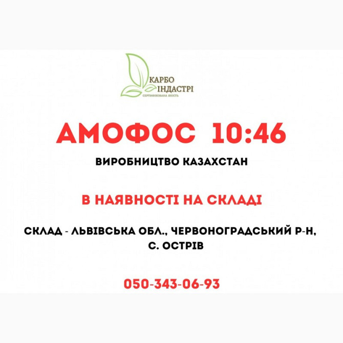 У наявності на складі у Львівській області, Червоноградському районі, с. Острів, ми пропонуємо вам Амофос 10:46 - універсальне мінеральне добриво, що містить азот, фосфор та калій у оптимальних пропорціях для підживлення рослин на всіх етапах їхнього розвитку. Амофос 10:46 вироблено в Казахстані і...