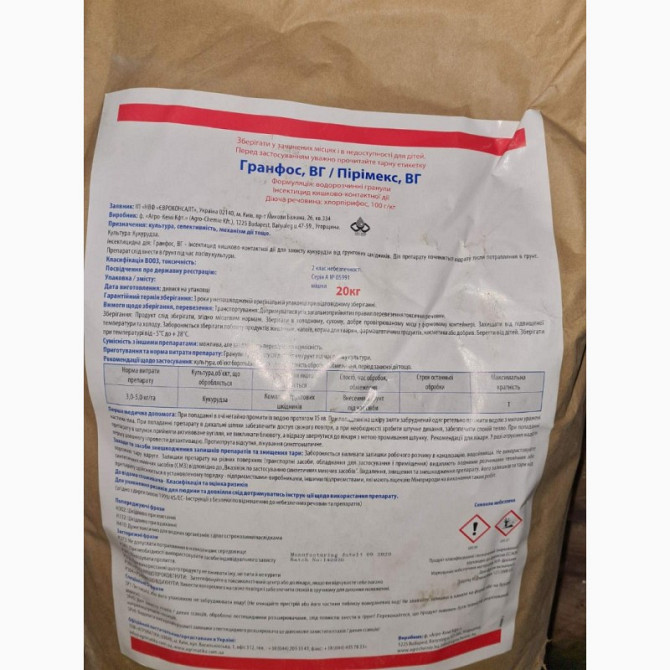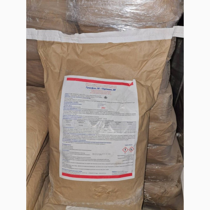 Гранфос - гранульований фосфорорганічний ґрунтовий інсектицид для контролю ґрунтових шкідників з високою ефективністю та довготривалою фумігантною дією. Діюча речовина: Хлорпірифос, 100 г/кг. Хімічна група: Фосфорорганічні сполуки. Прапаративна формула: Водорозчинні гранули. Спосіб дії: Контактно-ки...