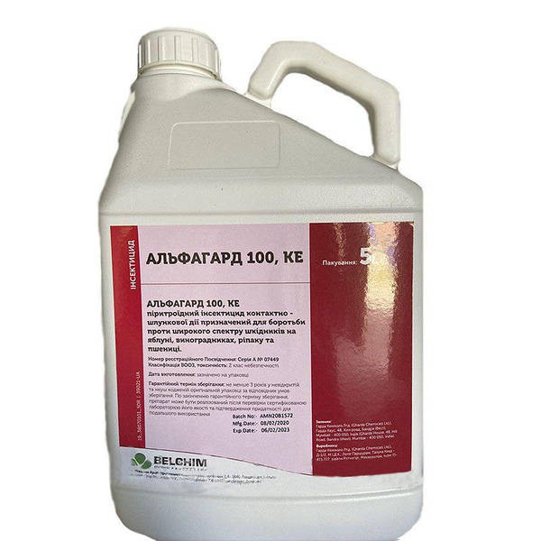 **АЛЬФАГАРД®: Піретроїдний інсектицид для захисту від шкідників** АЛЬФАГАРД® - це контактно-шлунковий інсектицид, який ефективно бореться з широким спектром шкідників на яблуні, виноградниках, ріпаку та пшениці. **Характеристики:** - **Діюча речовина:** Альфациперметрин 100 г/л - **Препаративна фо...